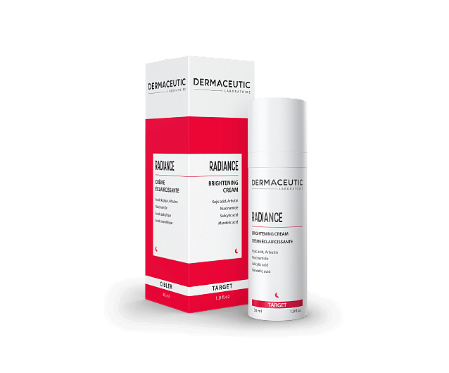 Ежедневный отбеливающий крем Dermaceutic Radiance Cream предназнгачен для борьбы с пигментацией. Крем подходит для кожи с нарушениями пигментации, неровного тона, тусклой, жирной, комбинированной и / или склонной к высыпанию кожи. Крем Dermaceutic Radiance имеет в составе койевую кислоту, арбутином, ниацинамидом, салициловую, миндальную кислоту, для выравнивания тона кожи лица, уменьшения пигментации и сияния кожи.